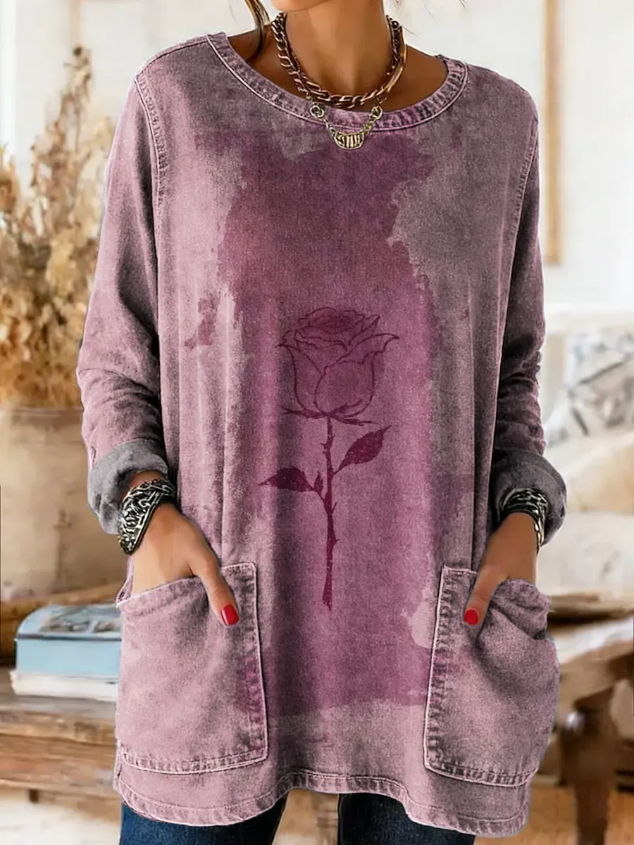 Women's Vintage Pink Rose Art Print Casual Long-sleeved Crew Neck Pocket Washed Cotton Denim T-shirt