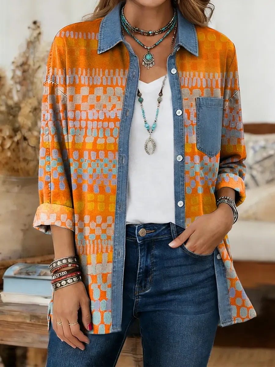 National Geometry Women's Print Casual Denim Patchwork Cotton Shirt