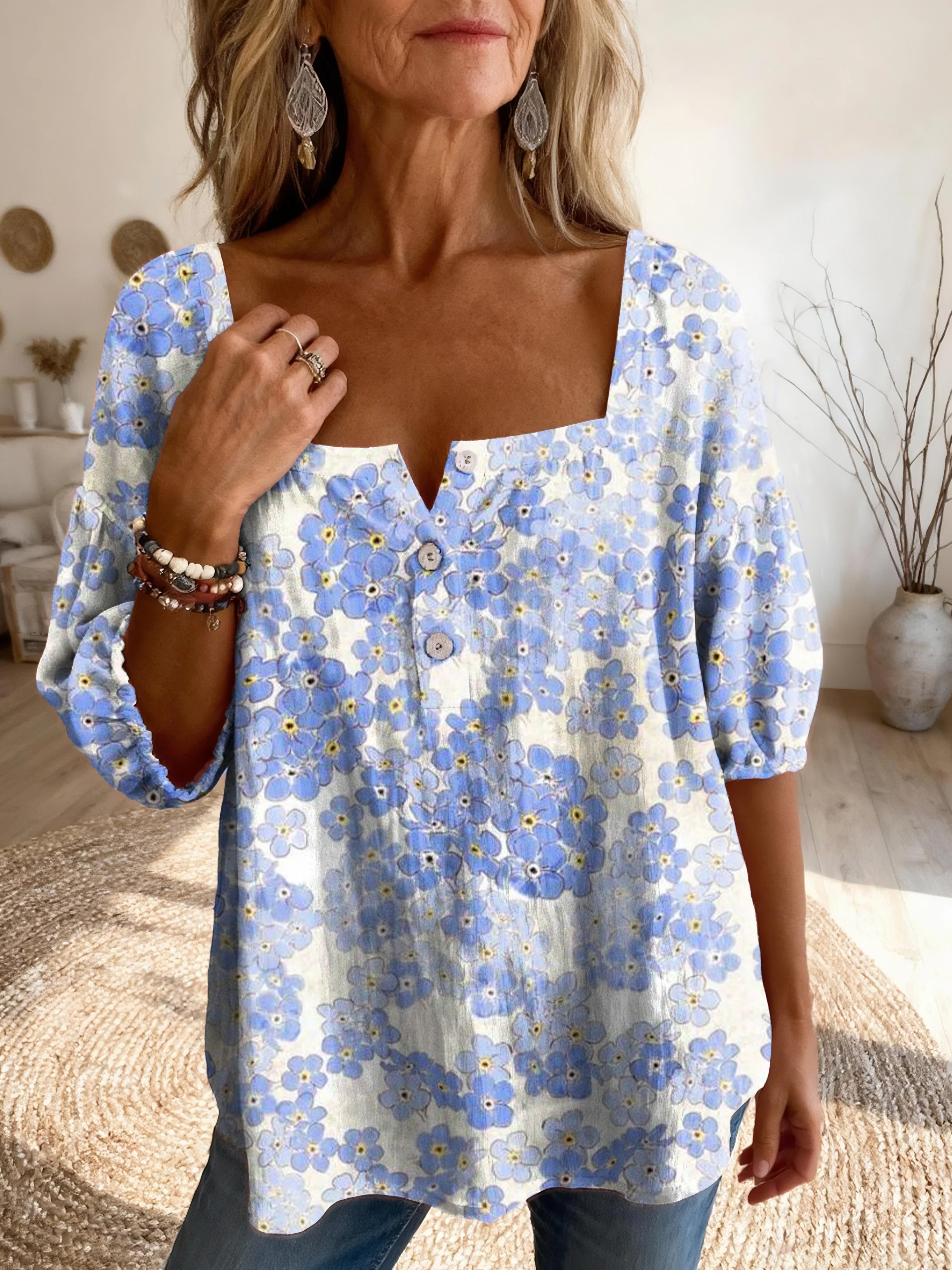 Women's Blue Sunflower Art Print Cwomen's Cute Hydrangea Art Print Casual Square Neck Button-down Cotton Shirtasual Square Neck Button-down Cotton Shirt