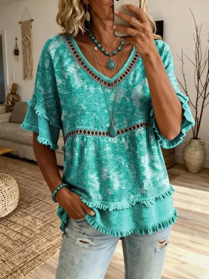 Women's Bohemian Floral Art Print Casual V-Neck Cutout Top
