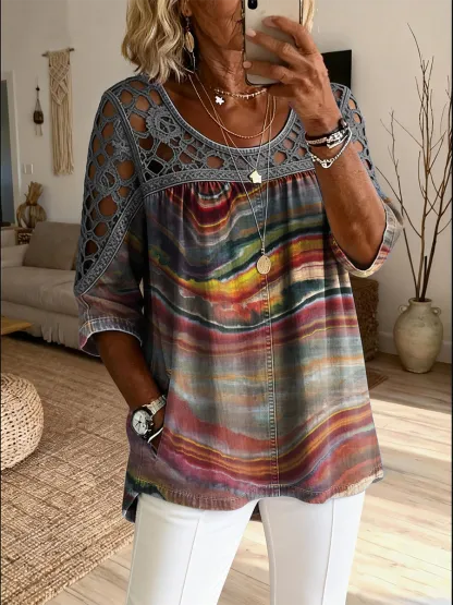 Women's Retro Art Print Casual Three-quarter Sleeve Round Neck Hollow-out Top