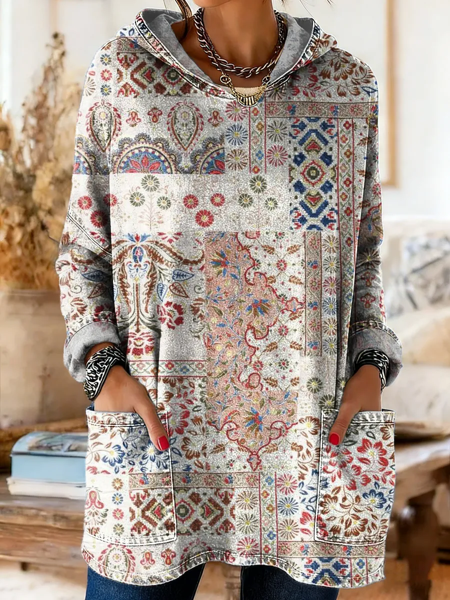 Women's Retro Bohemian Art Print Casual Long-Sleeved Hooded Pocket Washed Cotton Denim Top