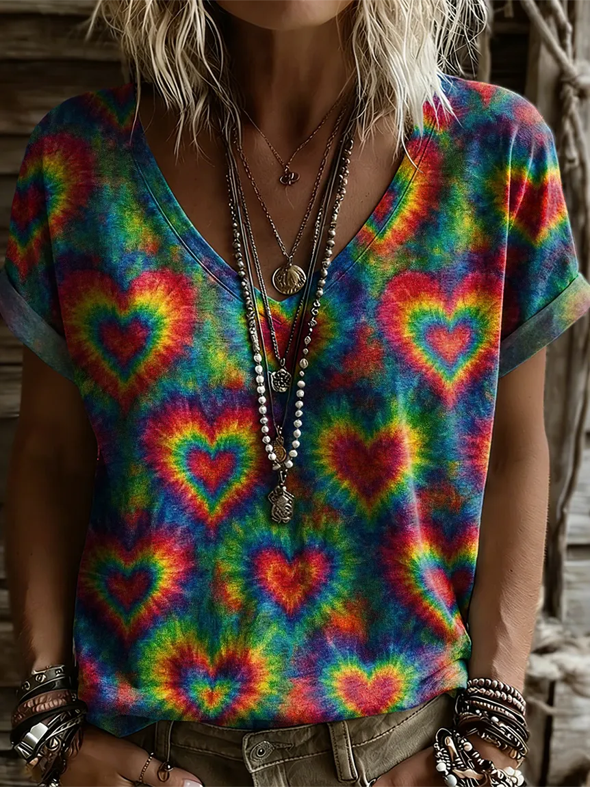 Women's Retro Colorful Heart Art Print Casual Short-sleeve V-neck T-shirt