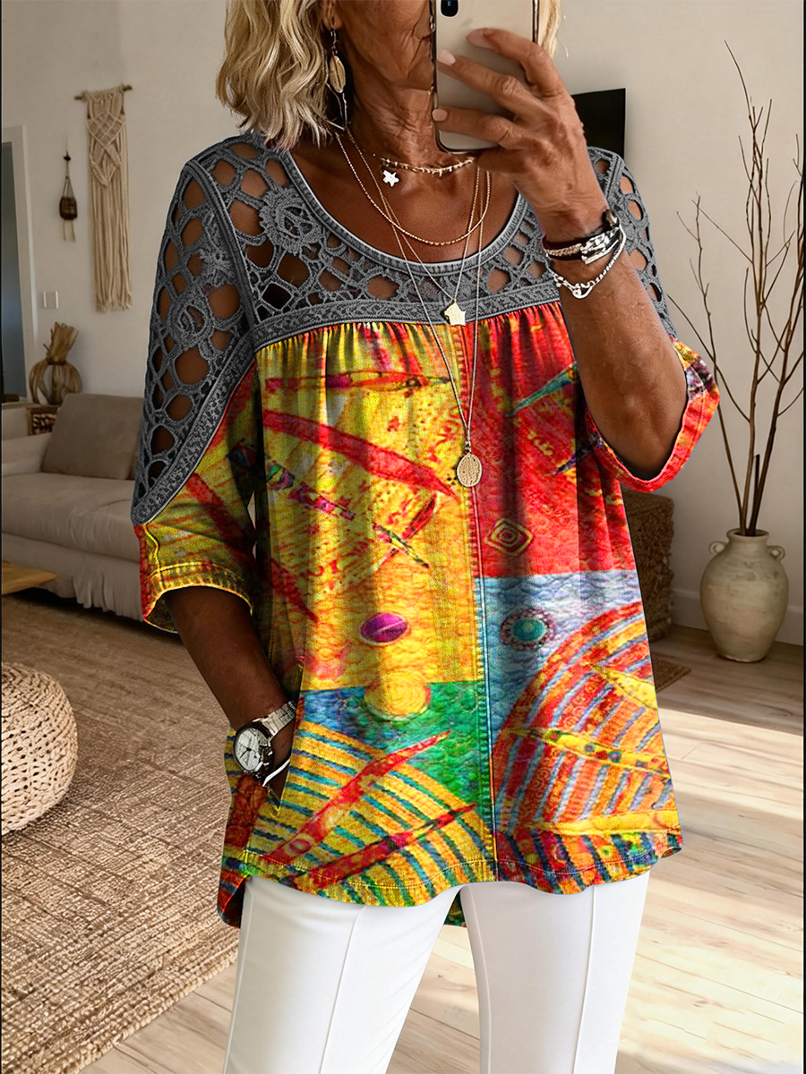 Women's Retro Colorful Sun Art Print Casual Three-quarter Sleeve Round Neck Hollow-out Top