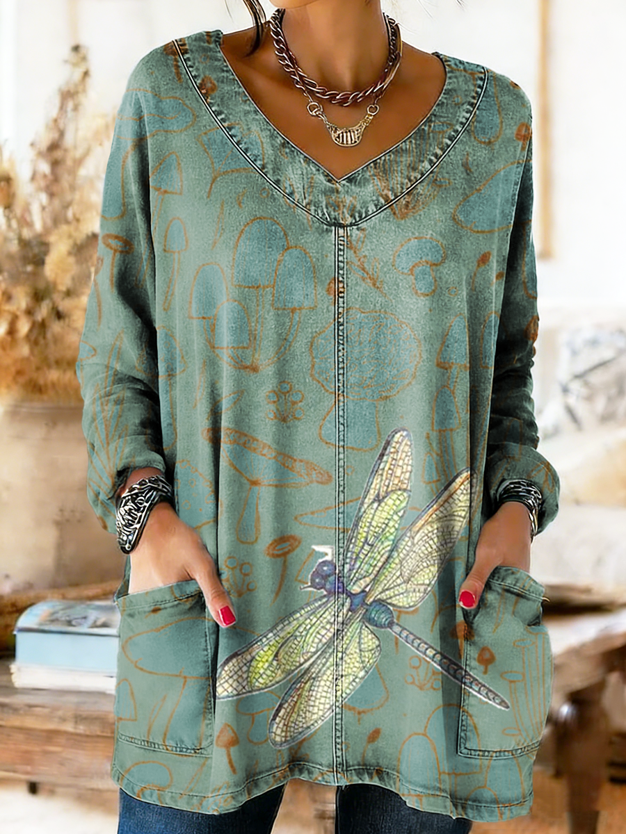 Women's Retro Dragonfly Art Print Casual Long-Sleeve V-Neck Pocket Washed Cotton Denim Top