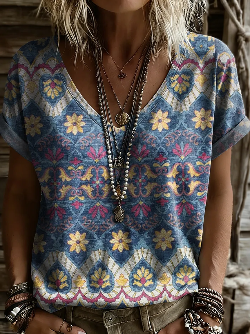 Women's Retro Ethnic Art Print Casual Short-sleeve V-neck T-shirt