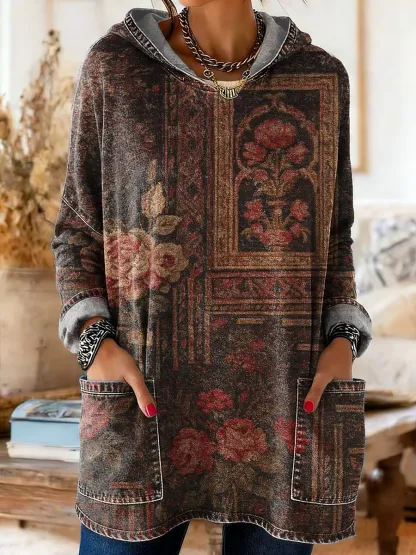 Women's Retro Ethnic Floral Art Print Casual Long-Sleeved Hooded Pocket Washed Cotton Denim Top