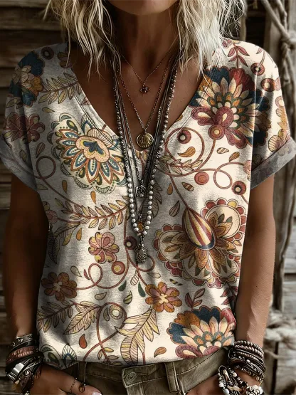 Women's Retro Ethnic Floral Art Print Casual Short-sleeve V-neck T-shirt