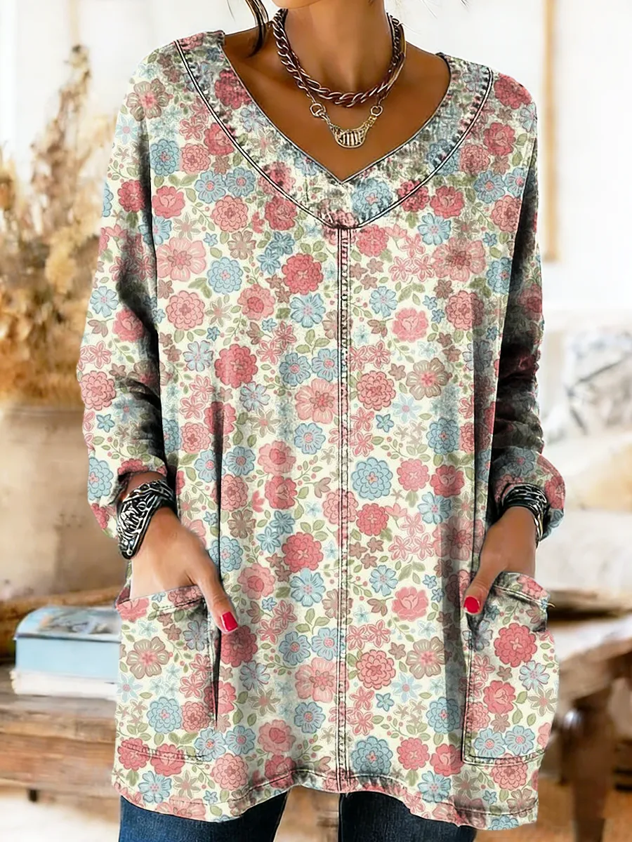 Women's Retro Floral Art Print Casual Long-Sleeve V-Neck Pocket Washed Cotton Denim Top
