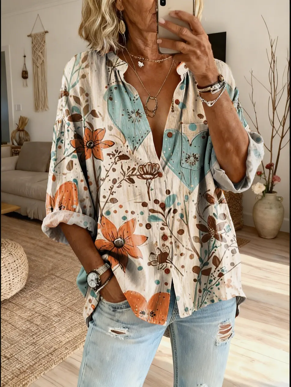 Women's Retro Heart Floral Art Print Casual Cotton Linen Shirt