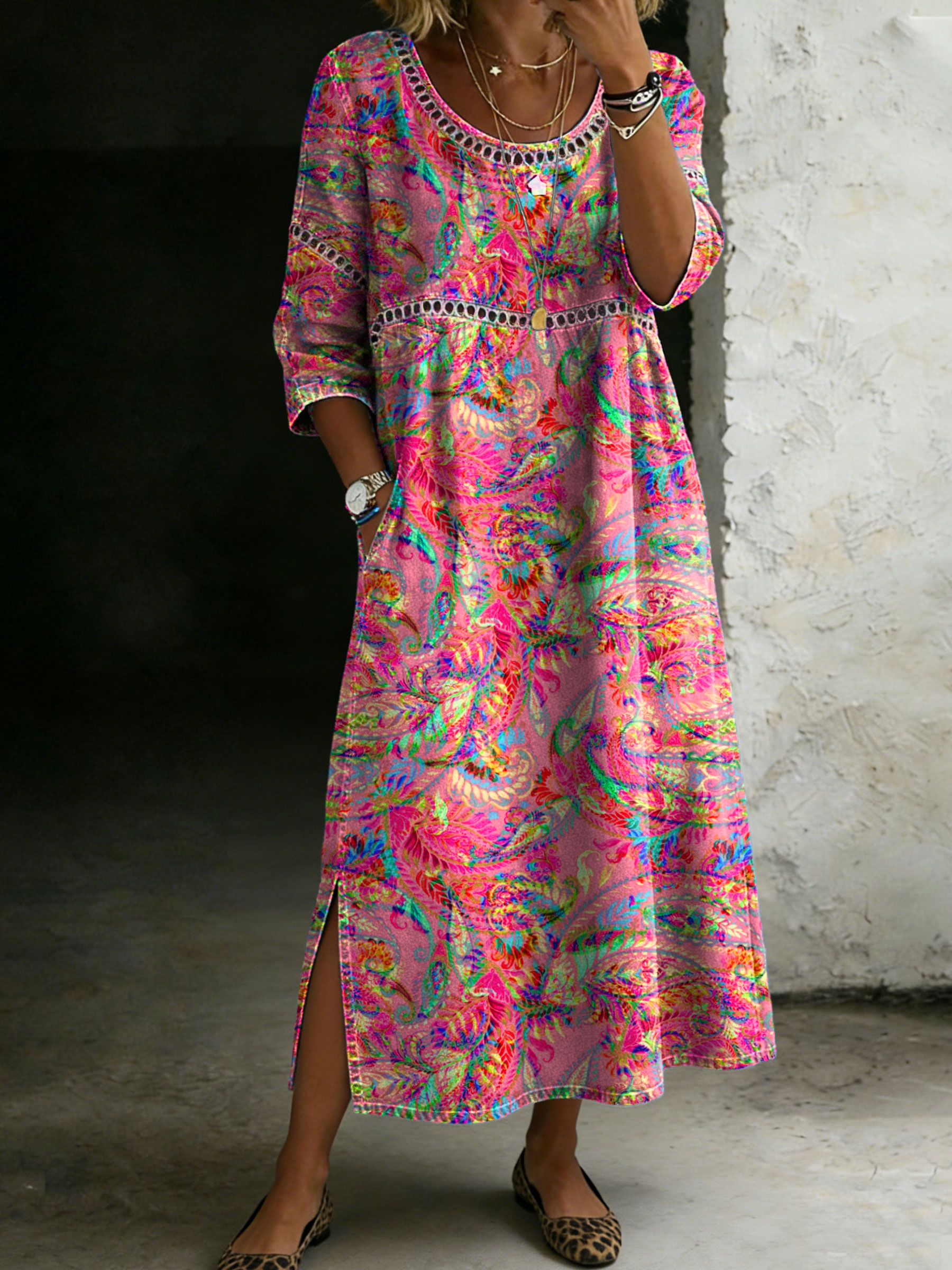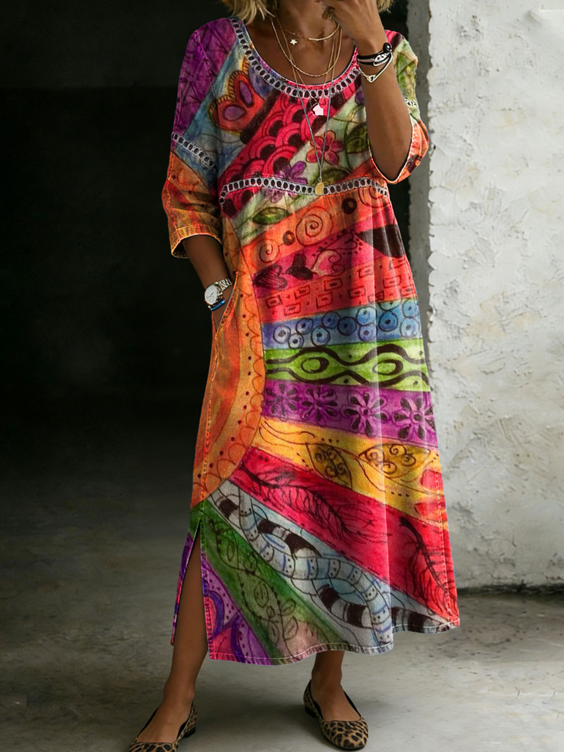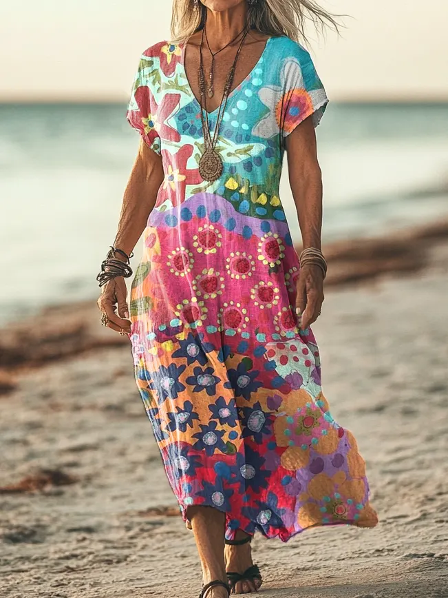 Women's Ethnic Floral Wave Patchwork Art Print V-Neck Cotton Pocket Dress