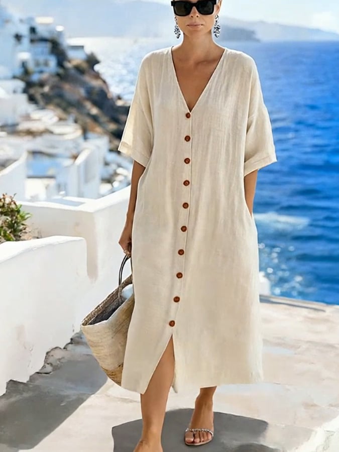 Women'S Casual Color-Block Cotton And Linen Dress