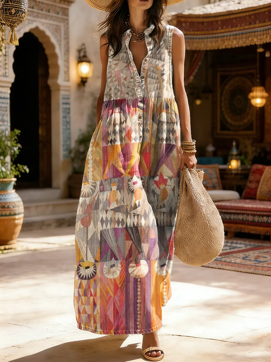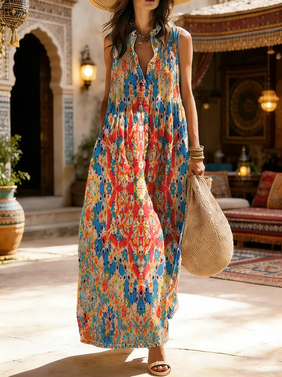 Women's Ethnic Print Sleeveless Cotton Pocket Dress