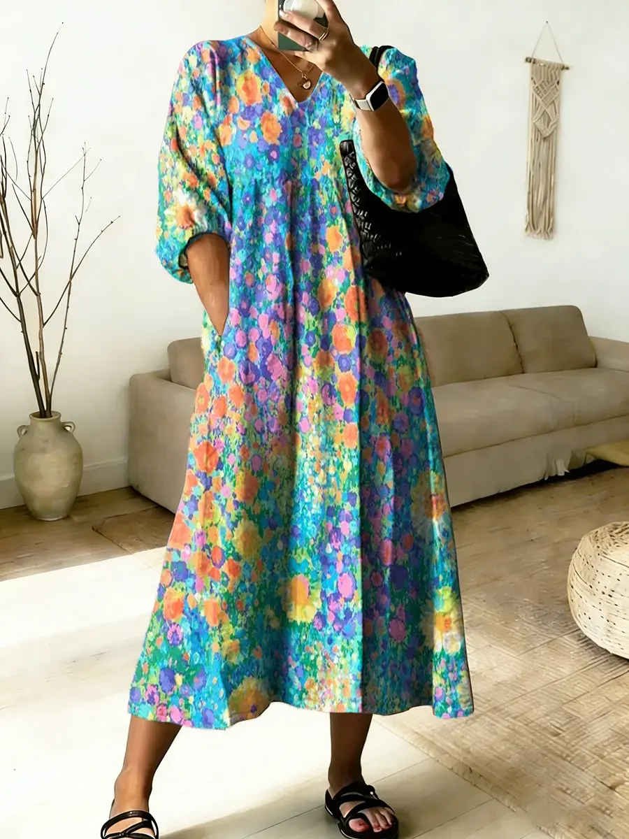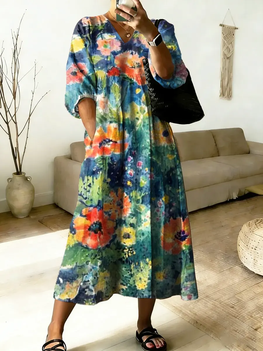 Women's Floral Art Print V-Neck Cotton Pocket Dress