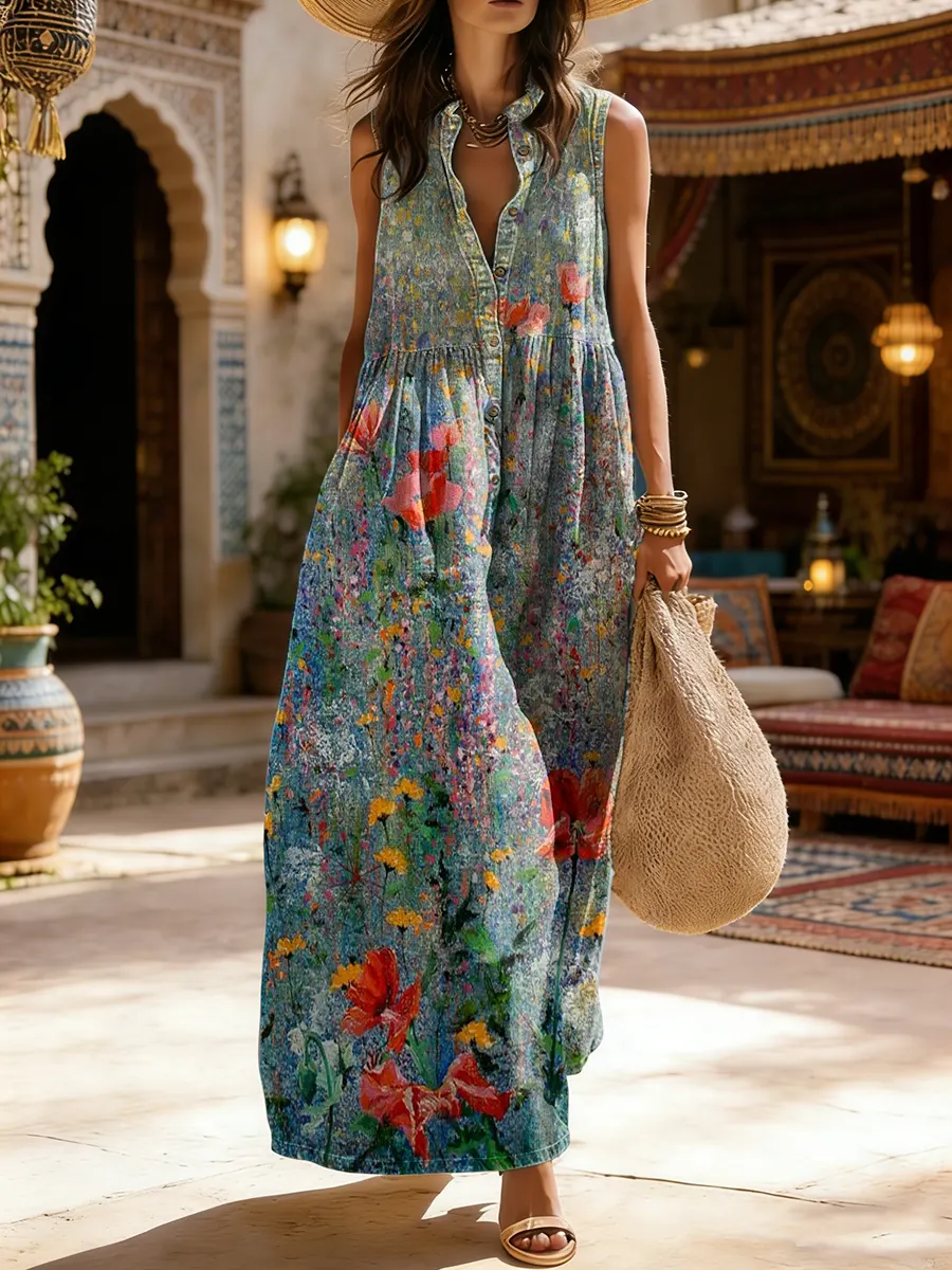 Women's Bohemian Floral Print Sleeveless Cotton Pocket Dress