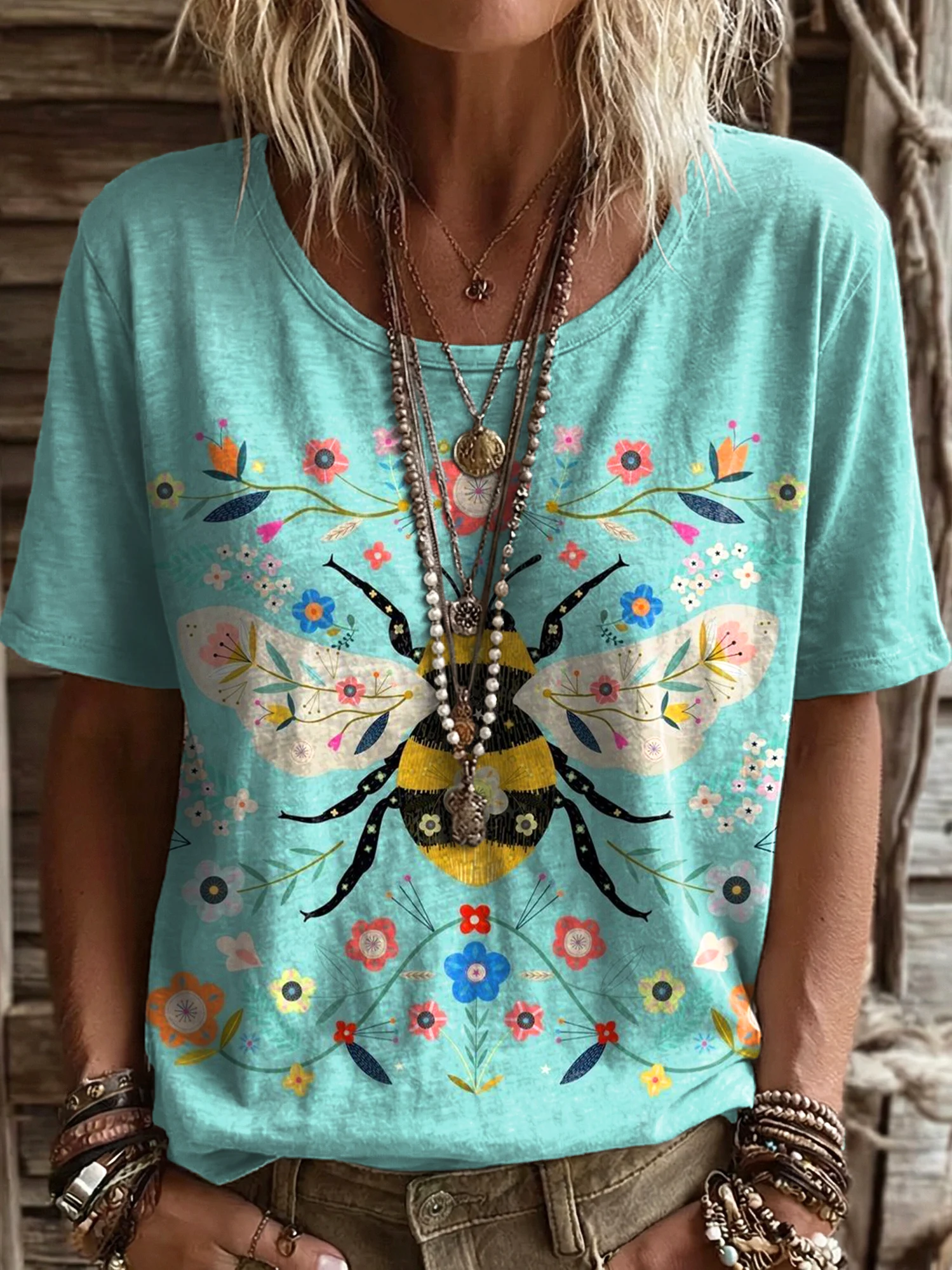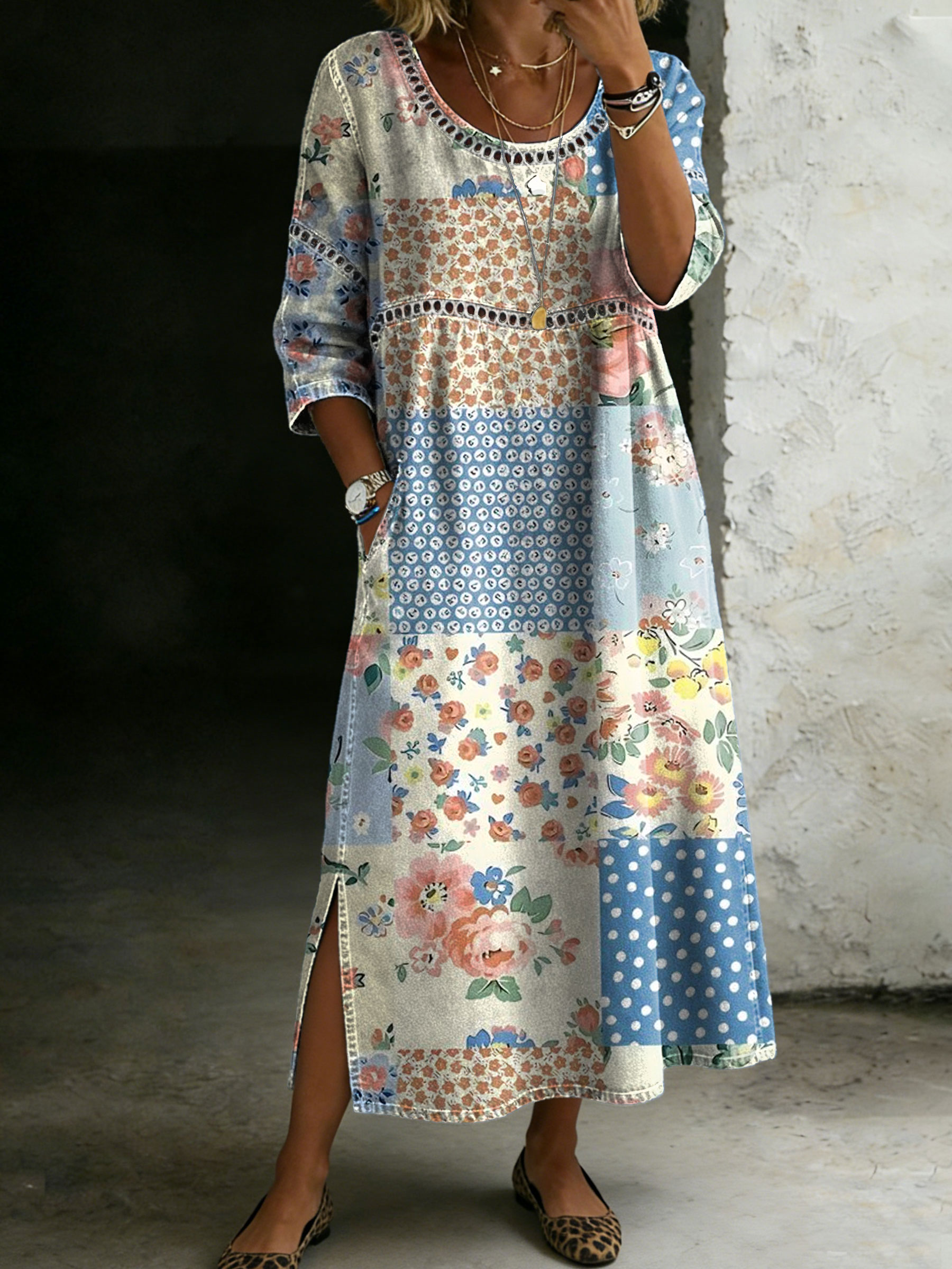 Women's Blue Floral Art Print Casual Crew Neck Patchwork Denim Dress