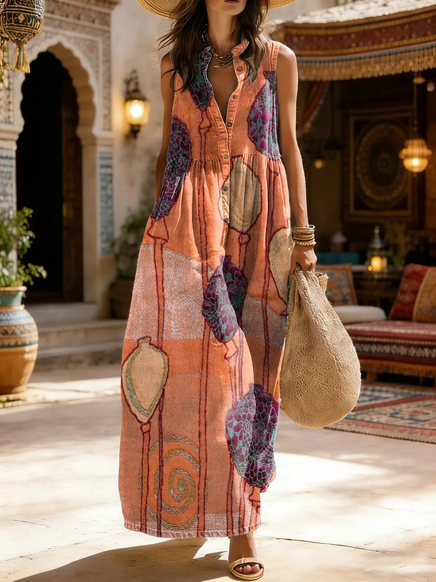 Women’s Vintage The Sun Print Casual Loose Denim Maxi Dress