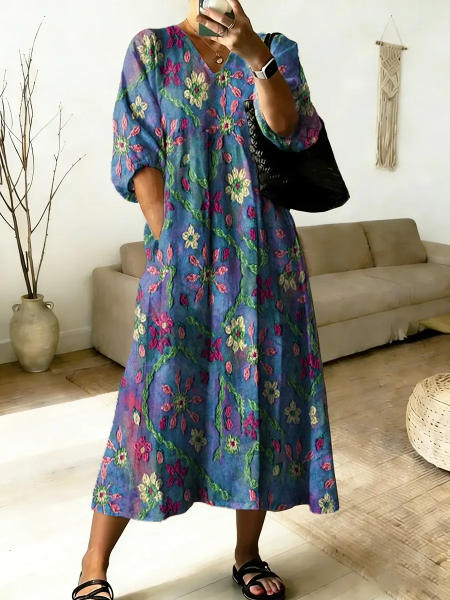Women's Folk Floral Art Print V-Neck Cotton Pocket Dress
