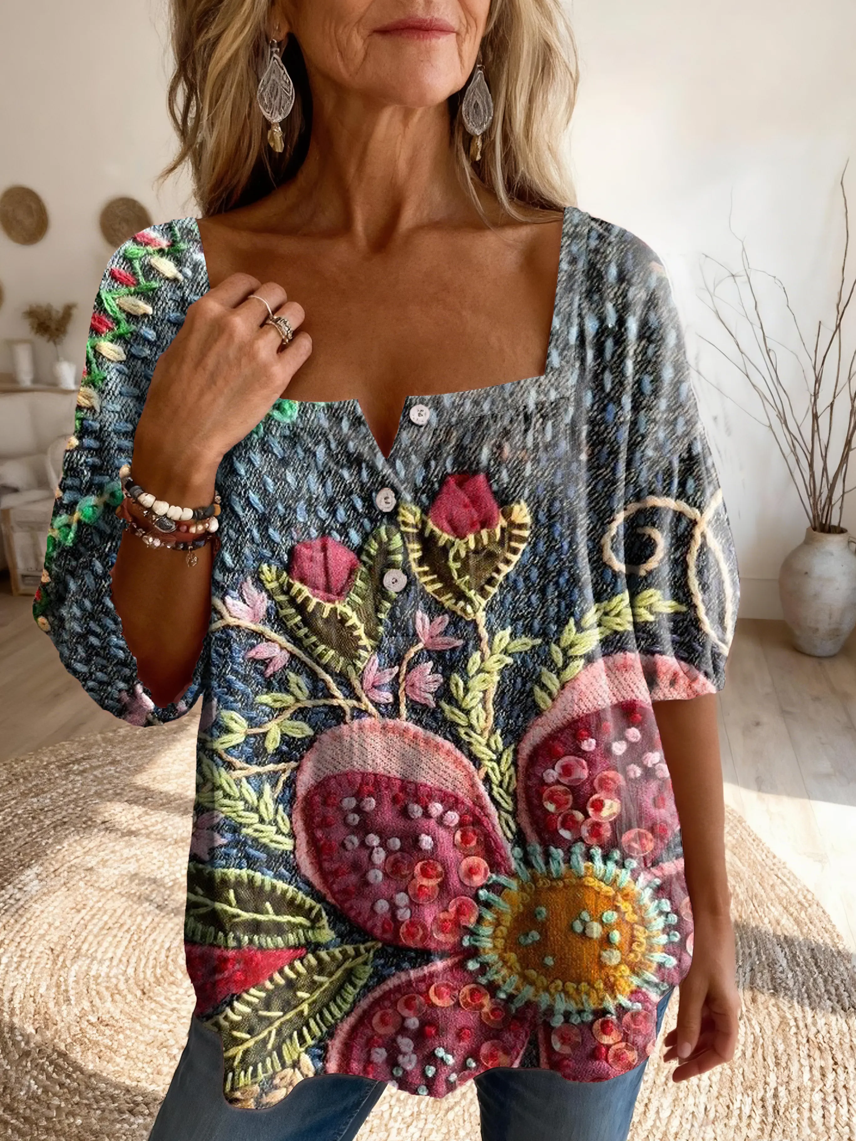 Women's Vintage Ethnic Floral Print Artistic Casual Square Neck Top