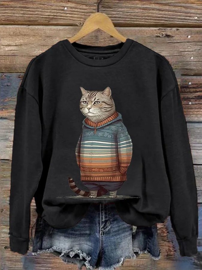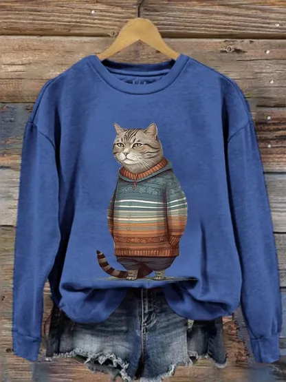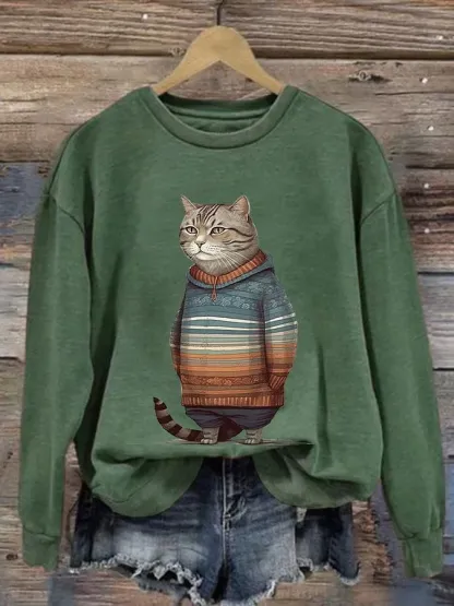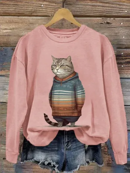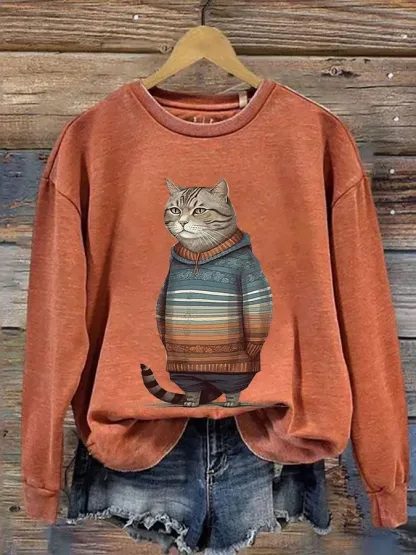 Funny Vintage Cat Art Print Casual Sweatshirt