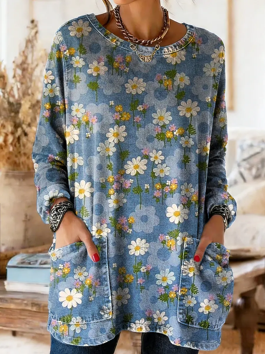 Women's Floral Art Print Casual Long-sleeve Crew Neck Pocket Cotton Denim T-shirt
