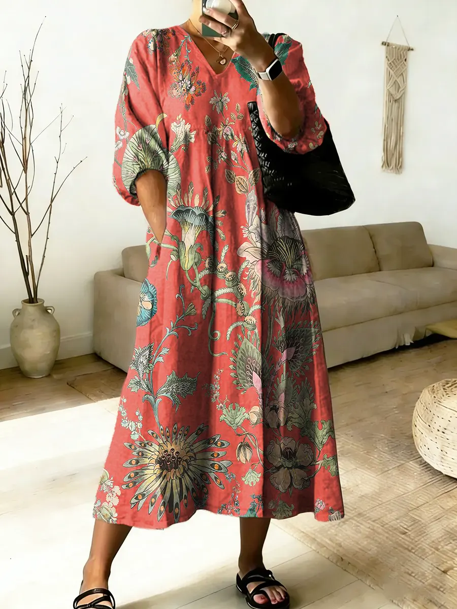 Women's Folk Floral Art Print V-Neck Cotton Pocket Dress