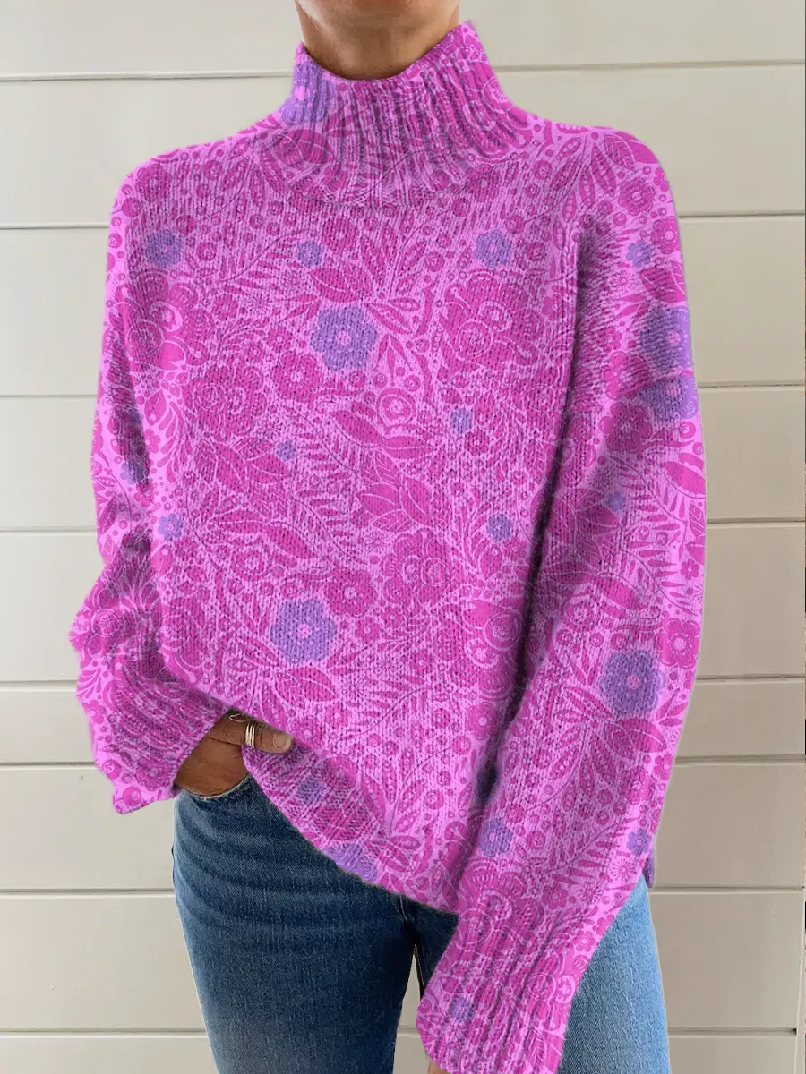 Women's Pink Art Breast Cancer Awareness Art Print Knit Turtleneck Pullover Sweater