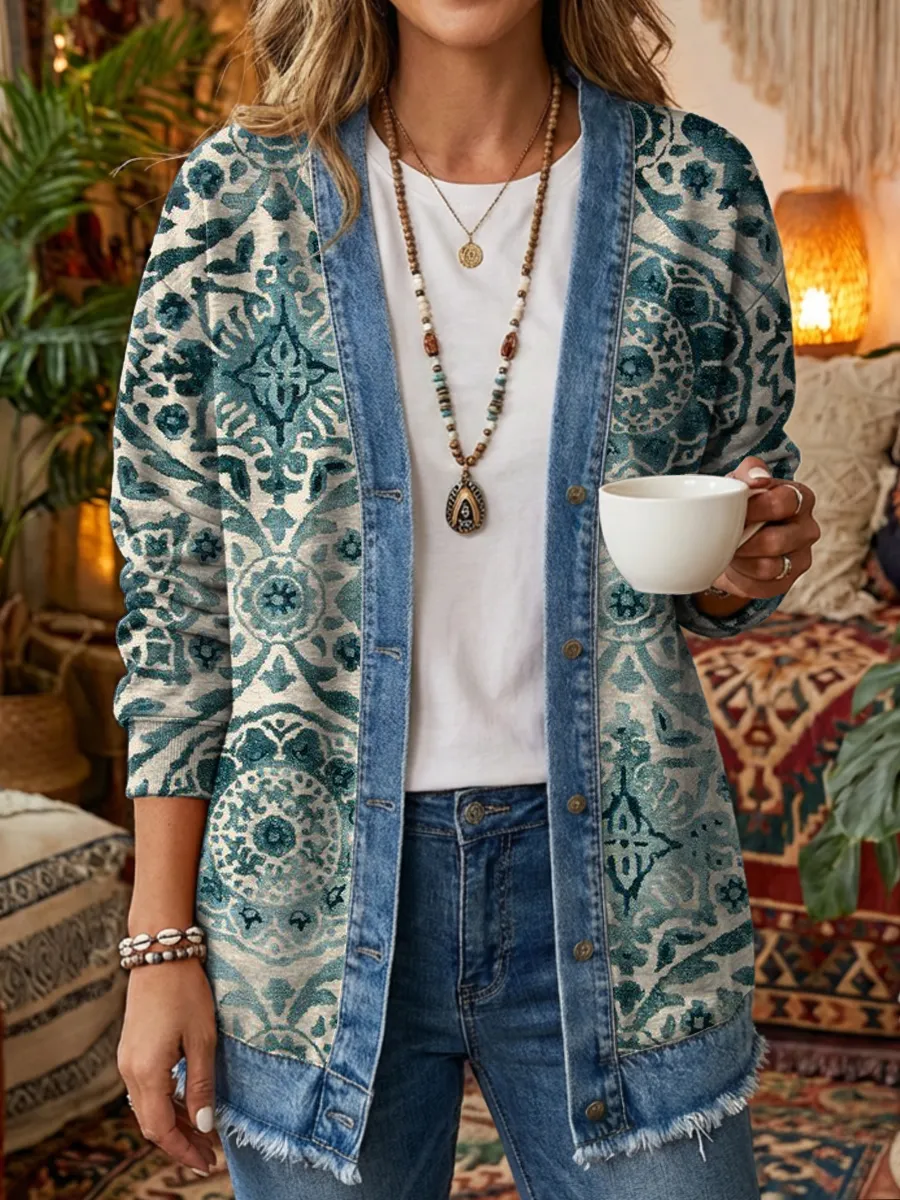 Women's Retro Ethnic Art Print Casual Long-Sleeved Washed Cotton Denim Cardigan Coat