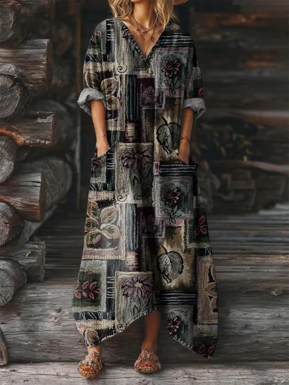 Women's Retro Ethnic Floral Art Print Casual Long-Sleeve V-Neck Pocket Washed Cotton Denim Dress