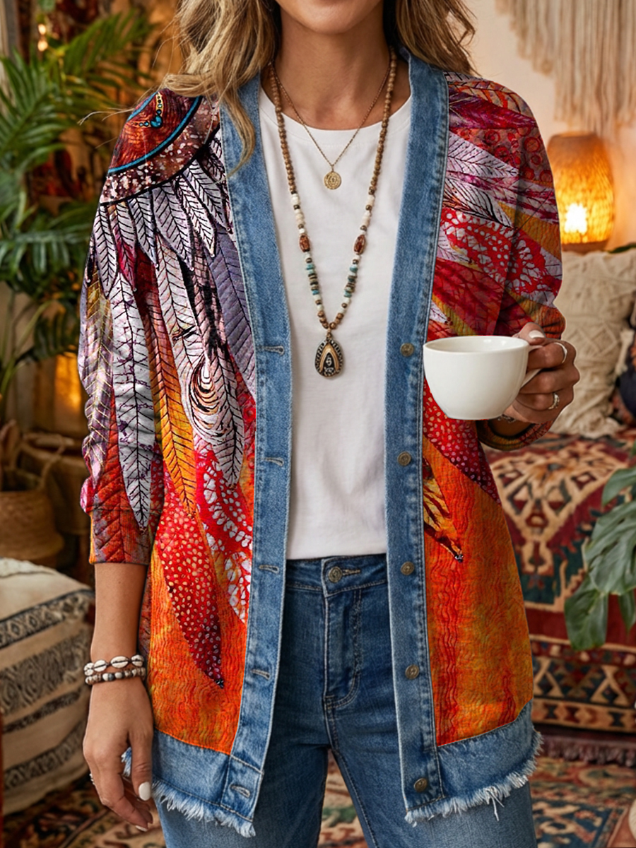 Women's Retro Ethnic Floral Art Print Casual Long-Sleeved Washed Cotton Denim Cardigan Coat