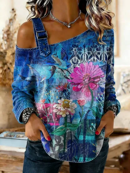 Women's Retro Floral Art Print Casual Long-Sleeved Camisole Washed Cotton Denim Top