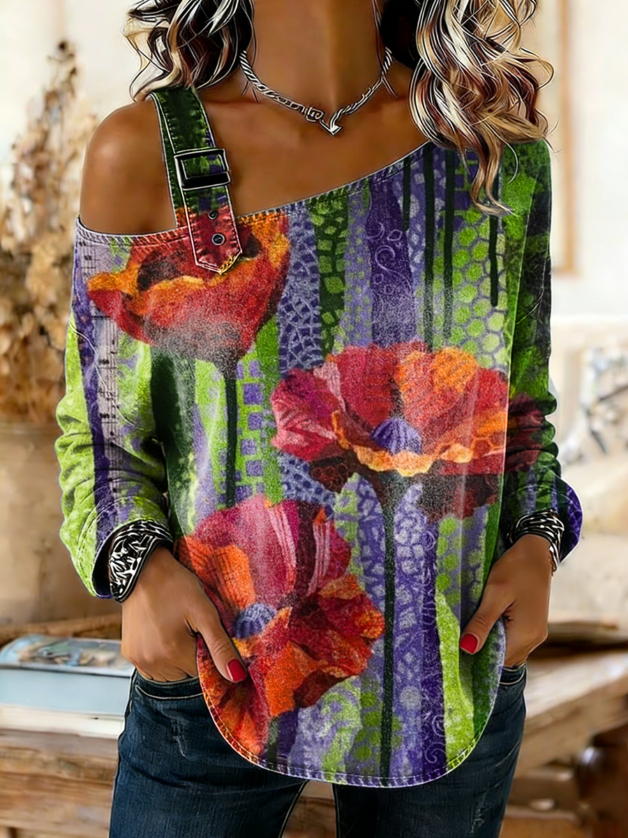Women's Retro Floral Colorful Art Print Casual Long-Sleeved Camisole Washed Cotton Denim Top