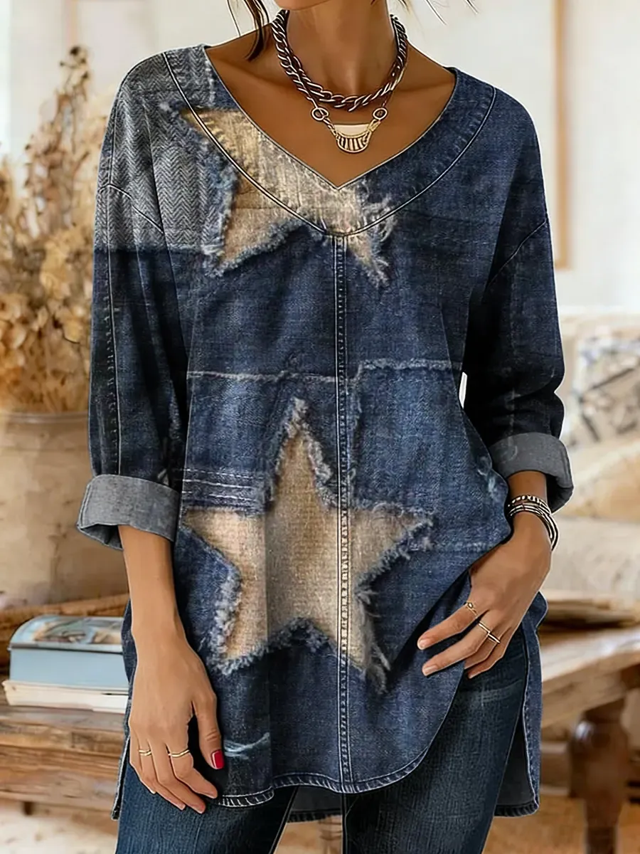 Women's Star Patchwork Art Print Casual Washed Denim Cotton Top