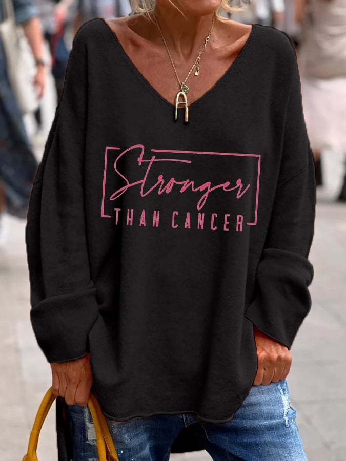 Women's Stronger Than Breast Cancer Awareness Printed Long Sleeve V-Neck Top