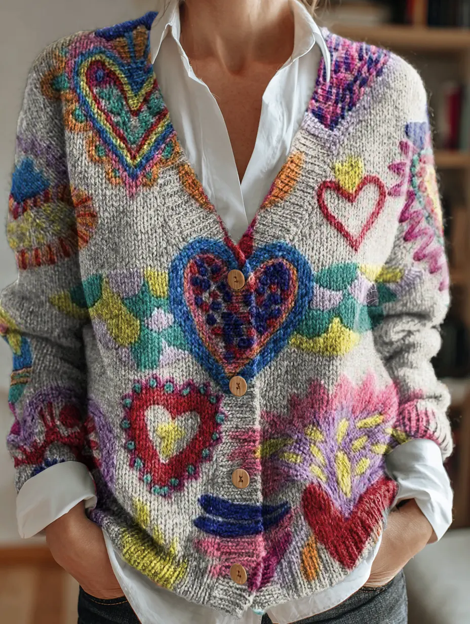 Women's Vintage Cute Heart Art Print Button-up V-neck Cardigan Sweater