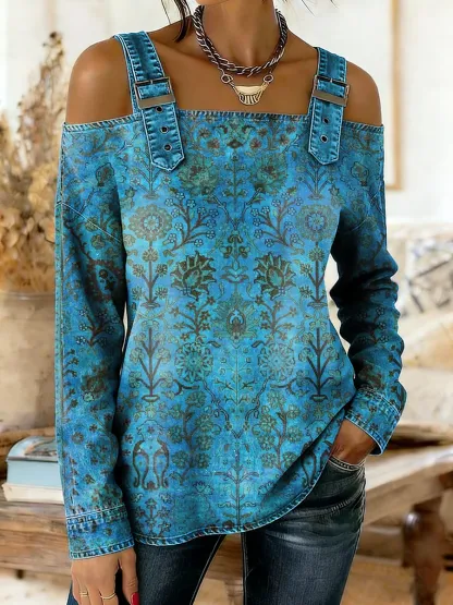 Women's Vintage Ethnic Blue Floral Totem Art Prints Casual Strapless Sling Wash Denim Blouse