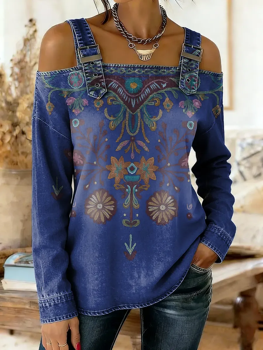 Women's Vintage Floral Art Print Casual Strapless Tank Washed Denim Shirt