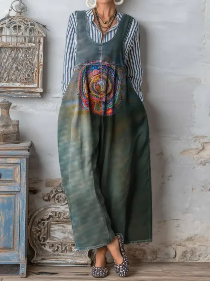 Women's Vintage Patchwork Art Print Denim Washed Cotton Dress