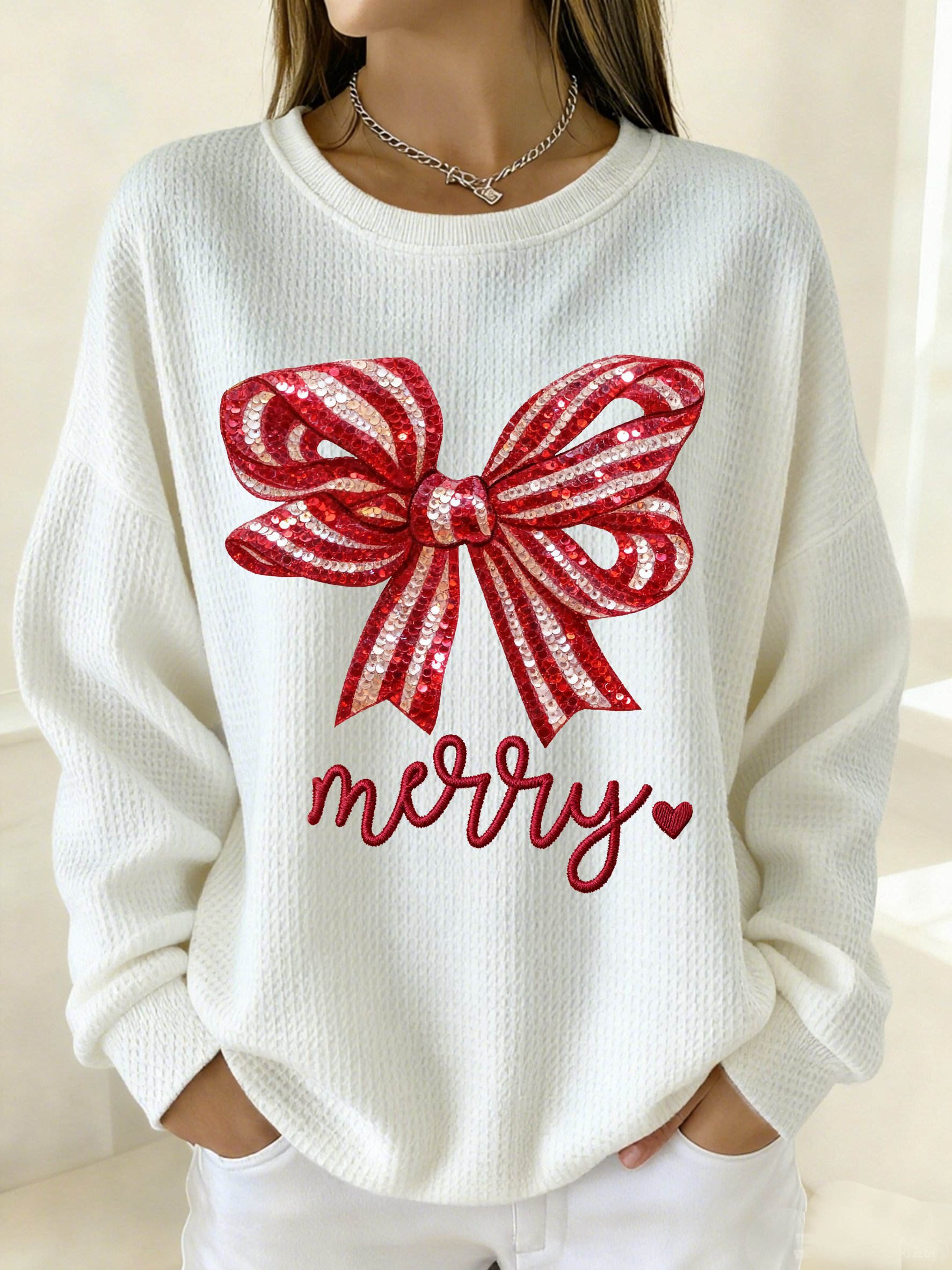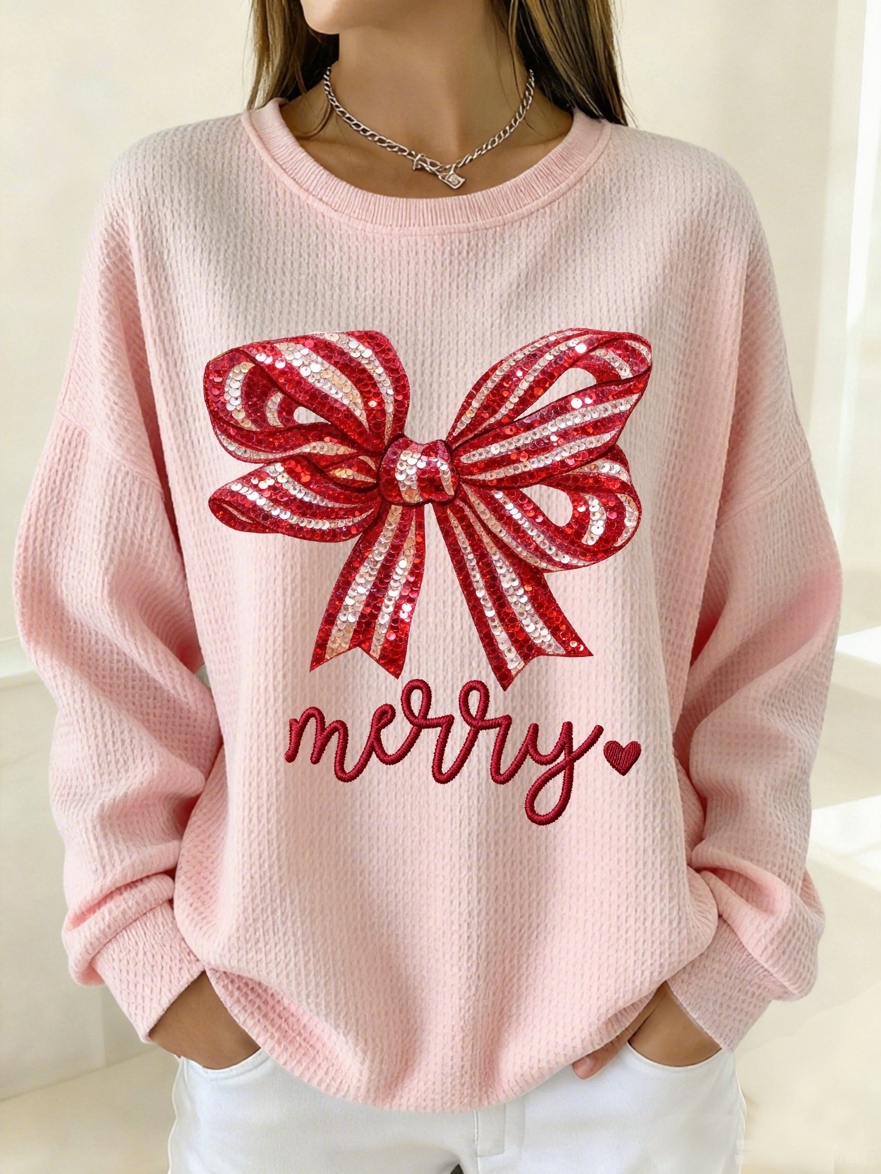 Women's Winter Christmas Bow Print Crew Neck Top