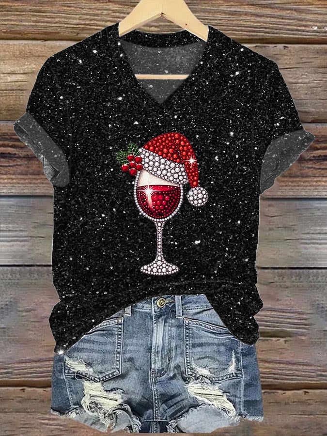 Women's Christmas Red Wine Glass Printed Casual T-Shirt