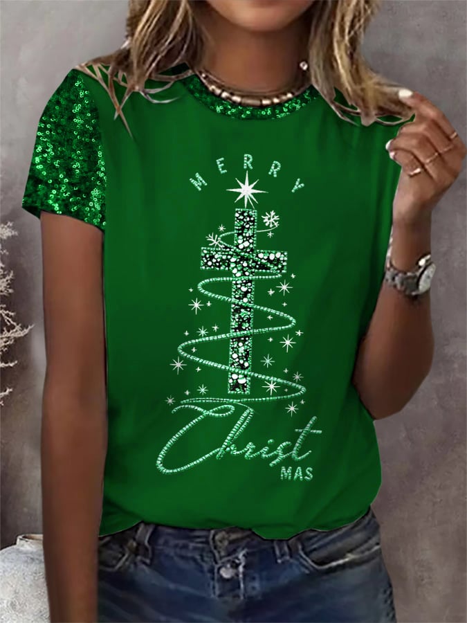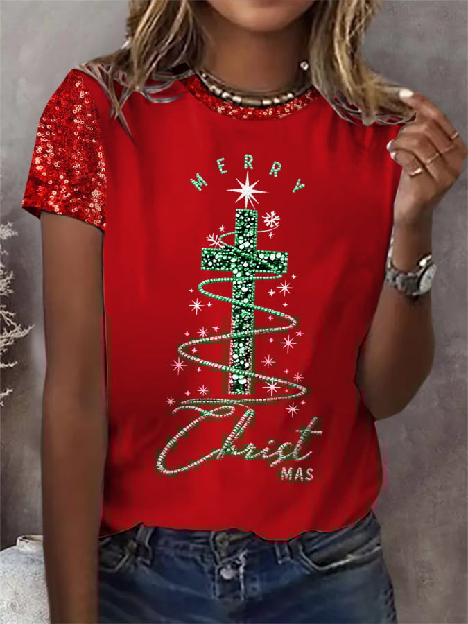 Women's Christmas Cross Print Round Neck T-Shirt