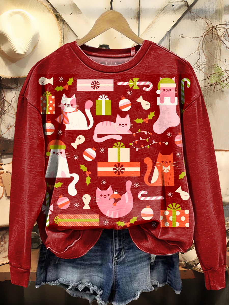Women's Retro Red Cat Christmas Art Print Casual Round Neck Pullover Sweatshirt