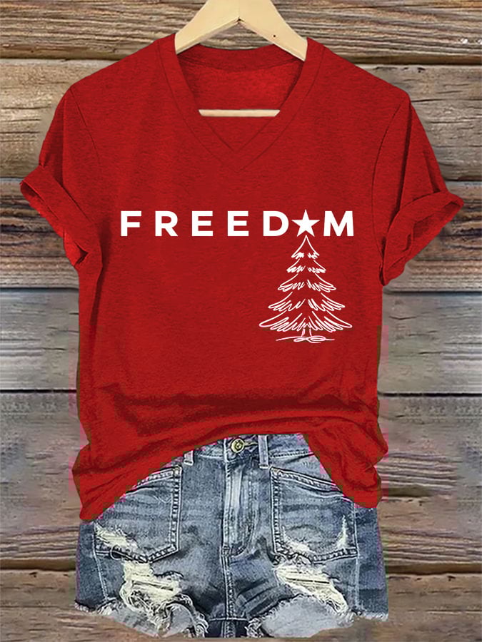 V-Neck Retro Christmas Freedom Memorial Print T-Shirt