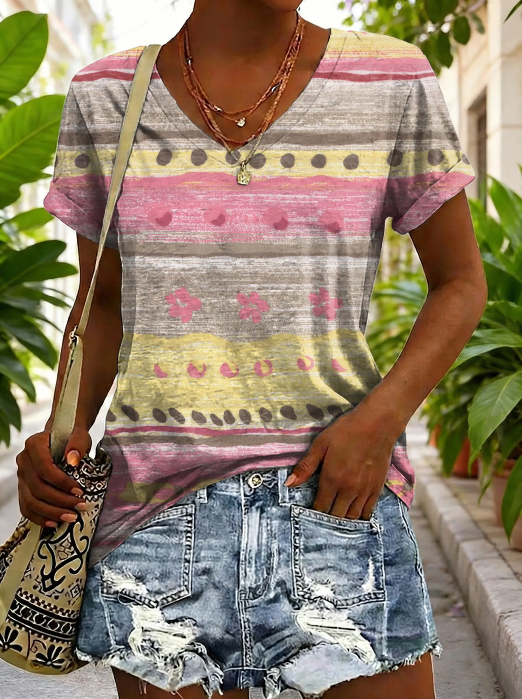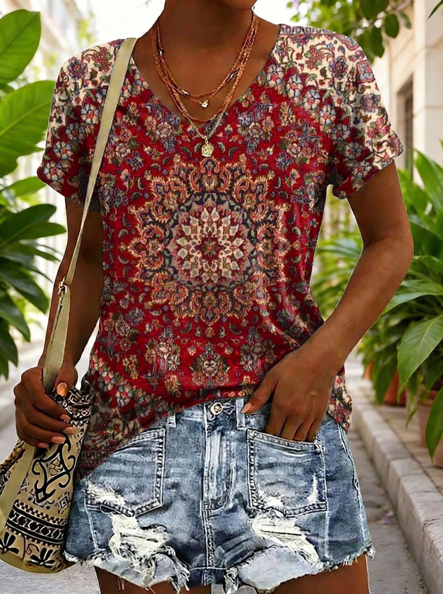Women's Bohemian Pattern Art Print Casual Short-sleeve V-neck Cotton T-shirt