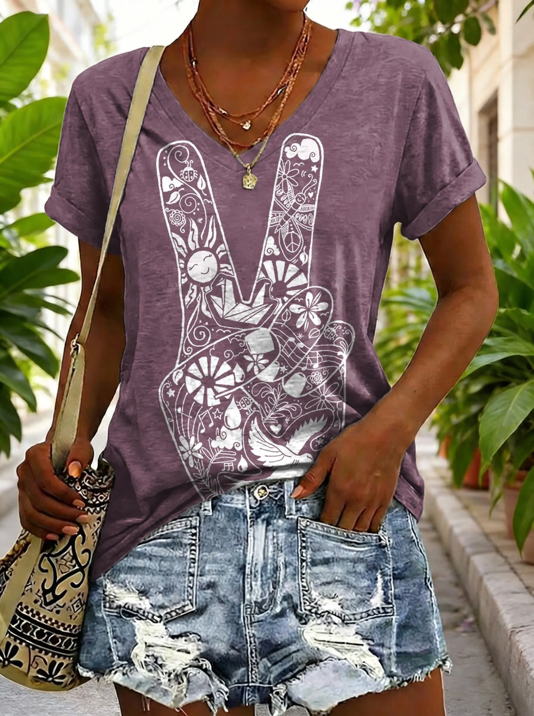 Hippie Peace Fingers Women's V-neck Print Casual T-shirt