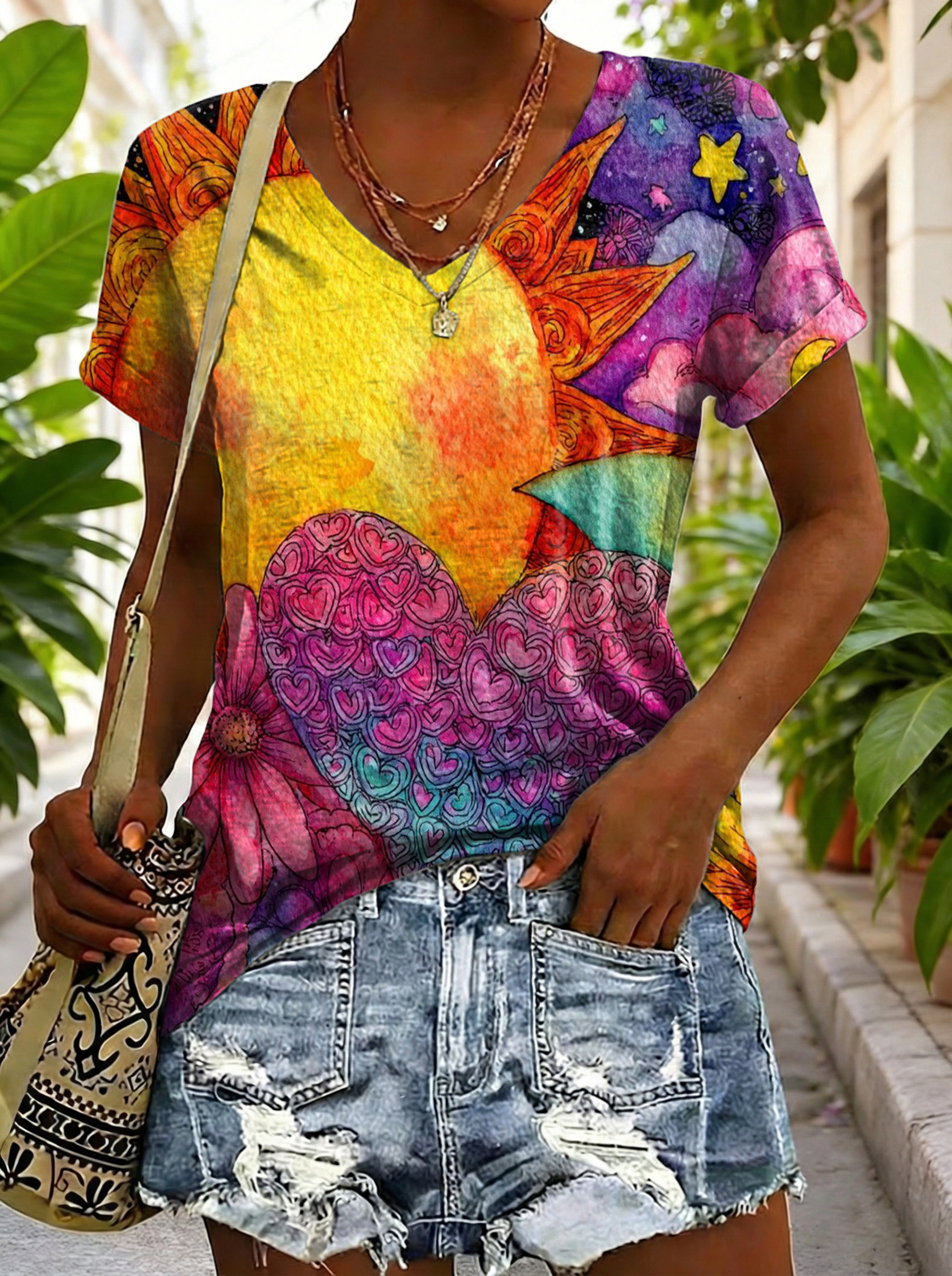 Womens Ethnic Watercolor Sun Floral Heart Art Print Casual V-neck Short Sleeve Cotton T-shirt