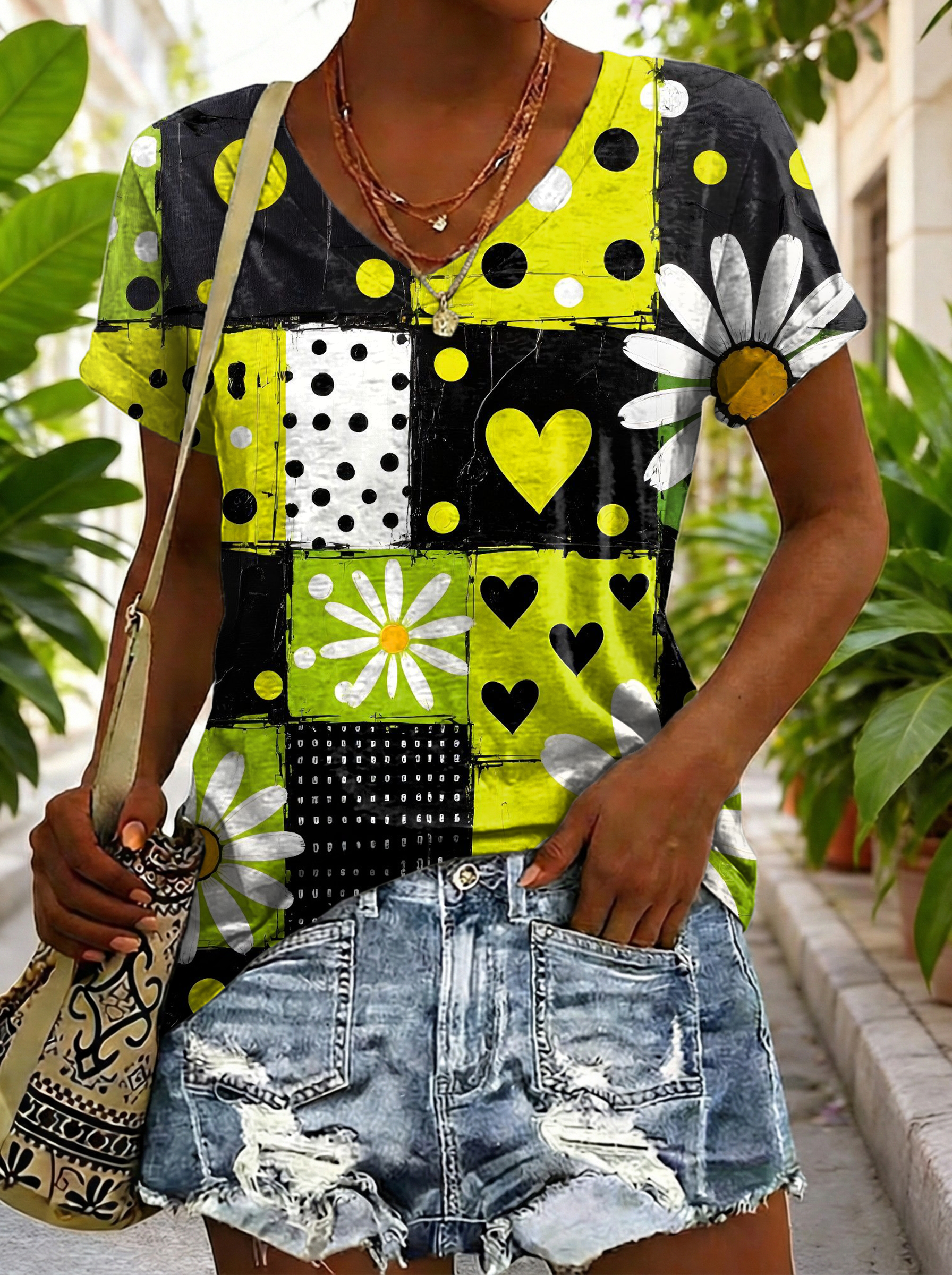 Women's Retro Heart Art Print Casual Short-Sleeve V-Neck Cotton T-Shirt