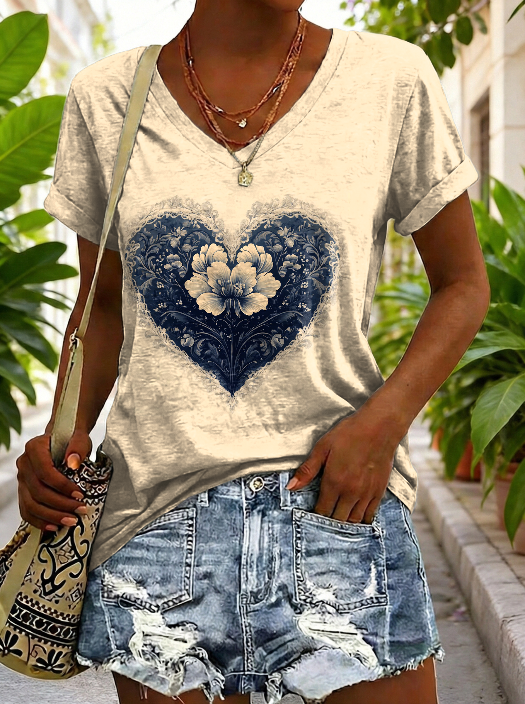 Women's Vintage Heart Floral Art Print Casual V-neck Short Sleeve Cotton T-shirt