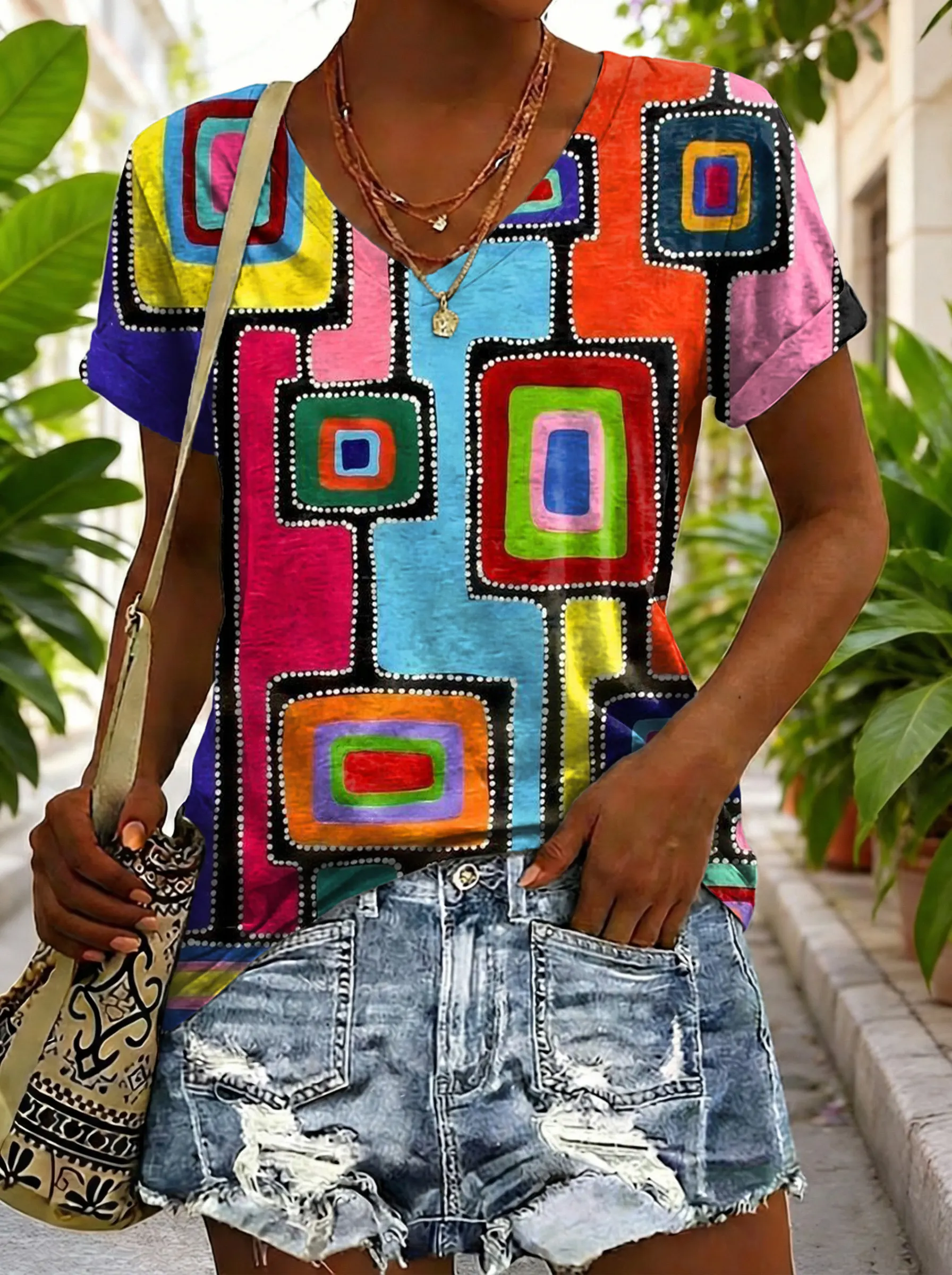 Women's Bohemian Abstract Geometric Pattern Art Print Casual Short-sleeve V-neck Cotton T-shirt