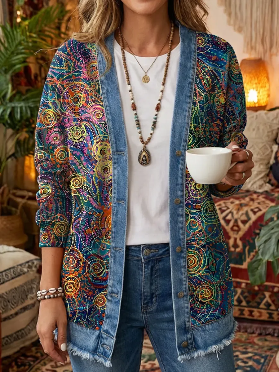 Ethnicity Abstract Lines Art Women's Art Print Casual Long Sleeve Denim Patchwork Shirt Coat
